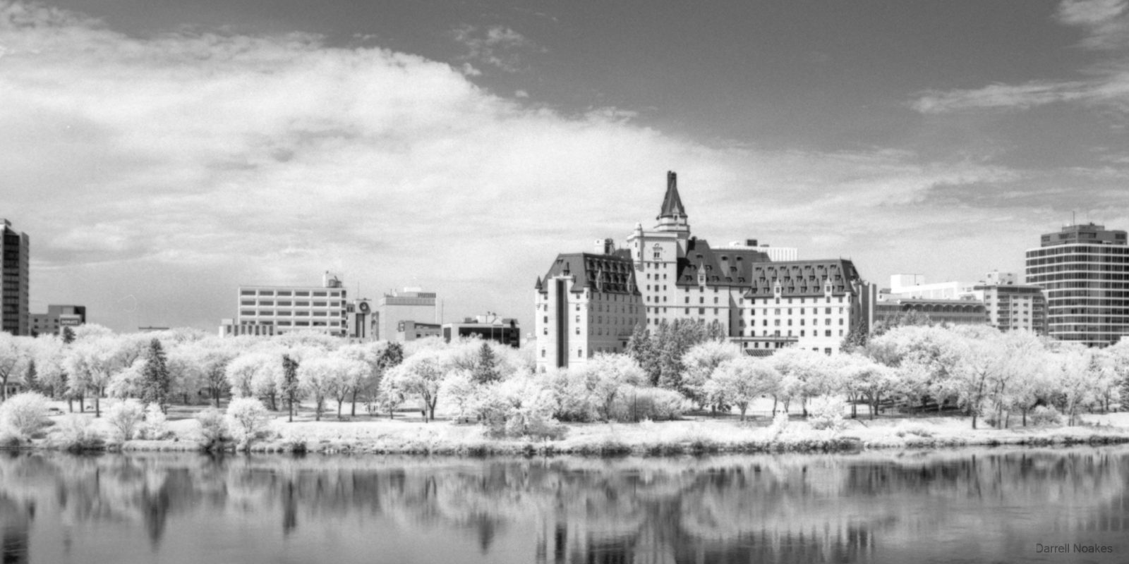 As expected, that first shot is pretty lackluster. It’s a good illustration of why every black-and-white photograph benefits from having a coloured filter over the lens. You’d never guess that the trees in the middle are bright with blossoms. With a specialized filter in place to block almost all visible light, the next photograph exposed for infrared wavelengths.