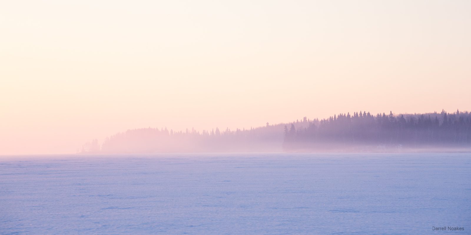 But tonight it’s not the owls that are keeping me awake. The northern lights have me mesmerized. Resting my head on my camp pillow to gaze at the electric sky through the open tent door, I’m unaware of sleep overtaking me in my cozy Polarguard cocoon. My eyes close for what seems like only a moment, and when I open them again I’m looking at an azure sky. The sun is just below the horizon. A mist has settled over the lake, glowing magenta in the dawn. Although the day is at its coldest, I feel warmed by the light. I crawl out of my sleeping bag, stumble out of the tent and step over to the open-air fireplace where Mark and I told stories over hot tea the previous evening. There are still a few embers alive in the firebox. I lay kindling around the coals and blow gently until the fire springs back to life. I put in a few larger pieces of wood, then go retrieve the items we’ll need for breakfast. Mark is standing out on the frozen lake, watching the sunrise.