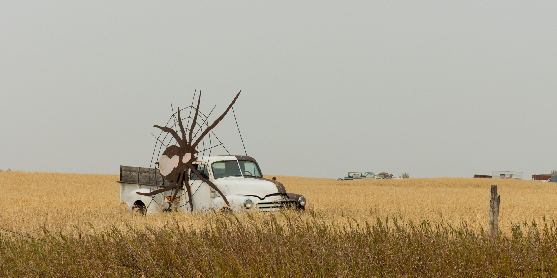 We stopped briefly to check out the unique signs for Spyder Autobody on Highway 14 and, later, a point of interest cairn alongside Highway 51.