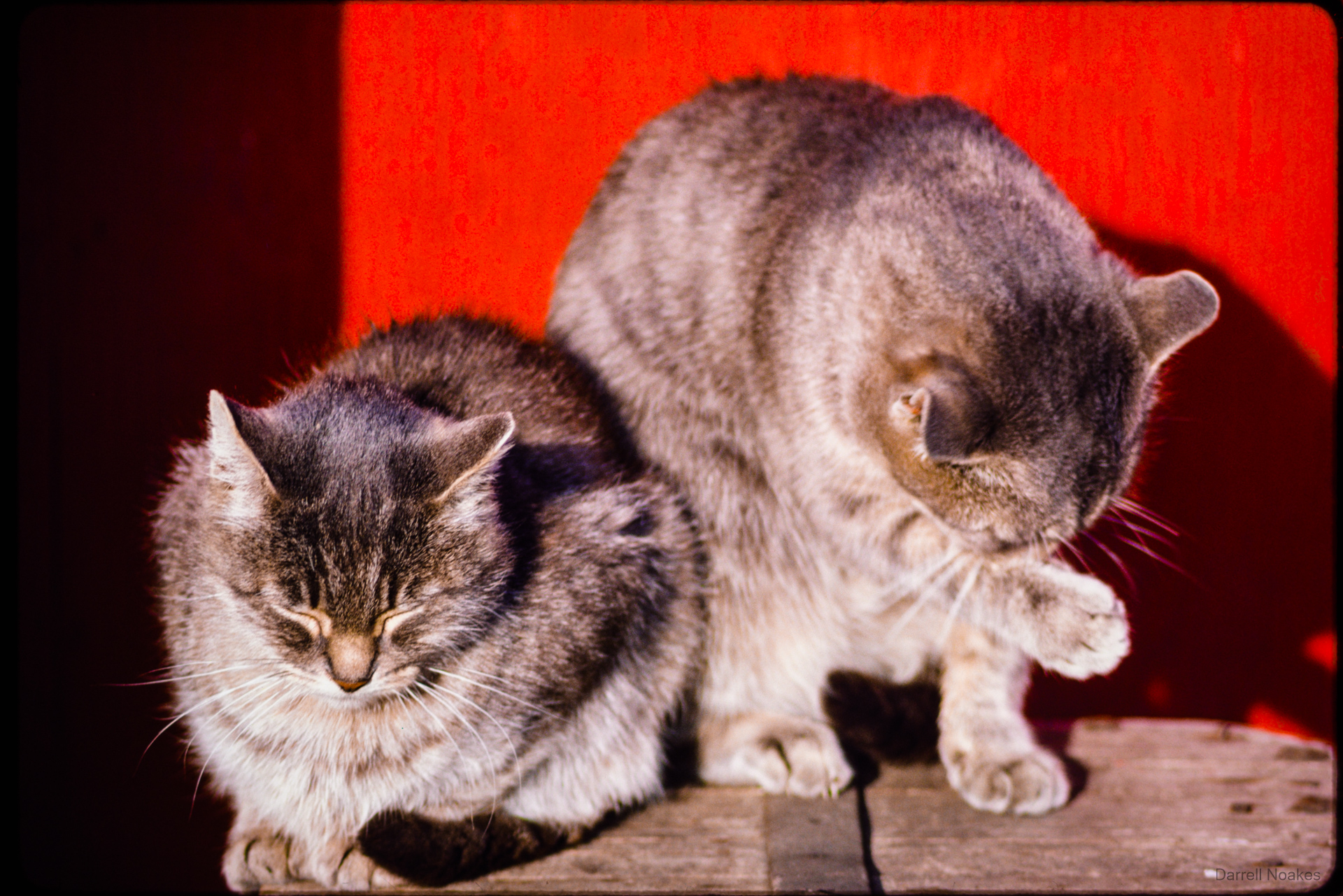 Barn cats relaxing in warm sunshine on a late autumn day, 1 November 1987. Barn cats staying warm in late autumn sunshine beside red painted wall of storage shed, 1 November 1987. (Kodachrome slide by Darrell Noakes) Share this article
