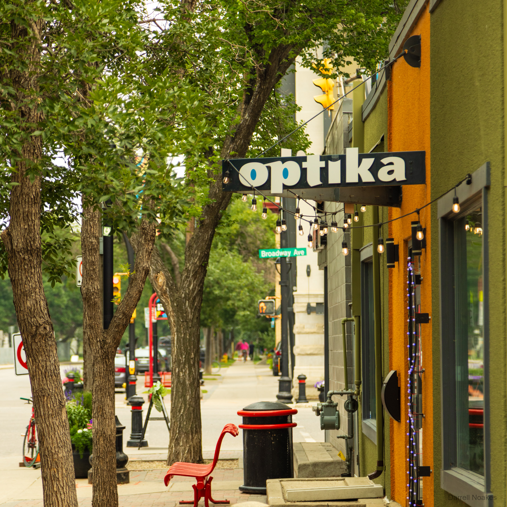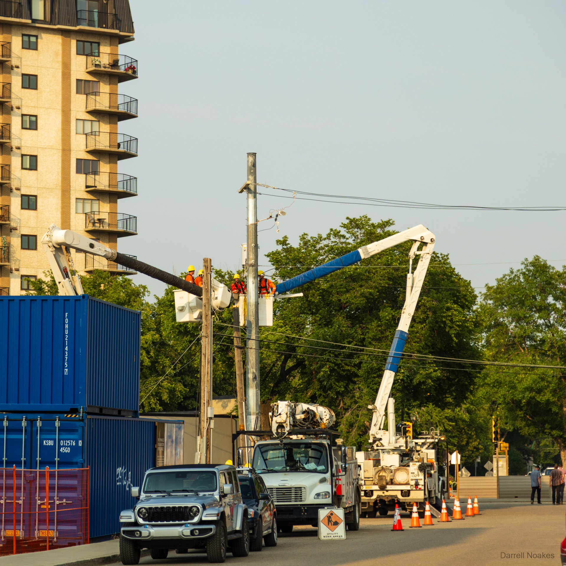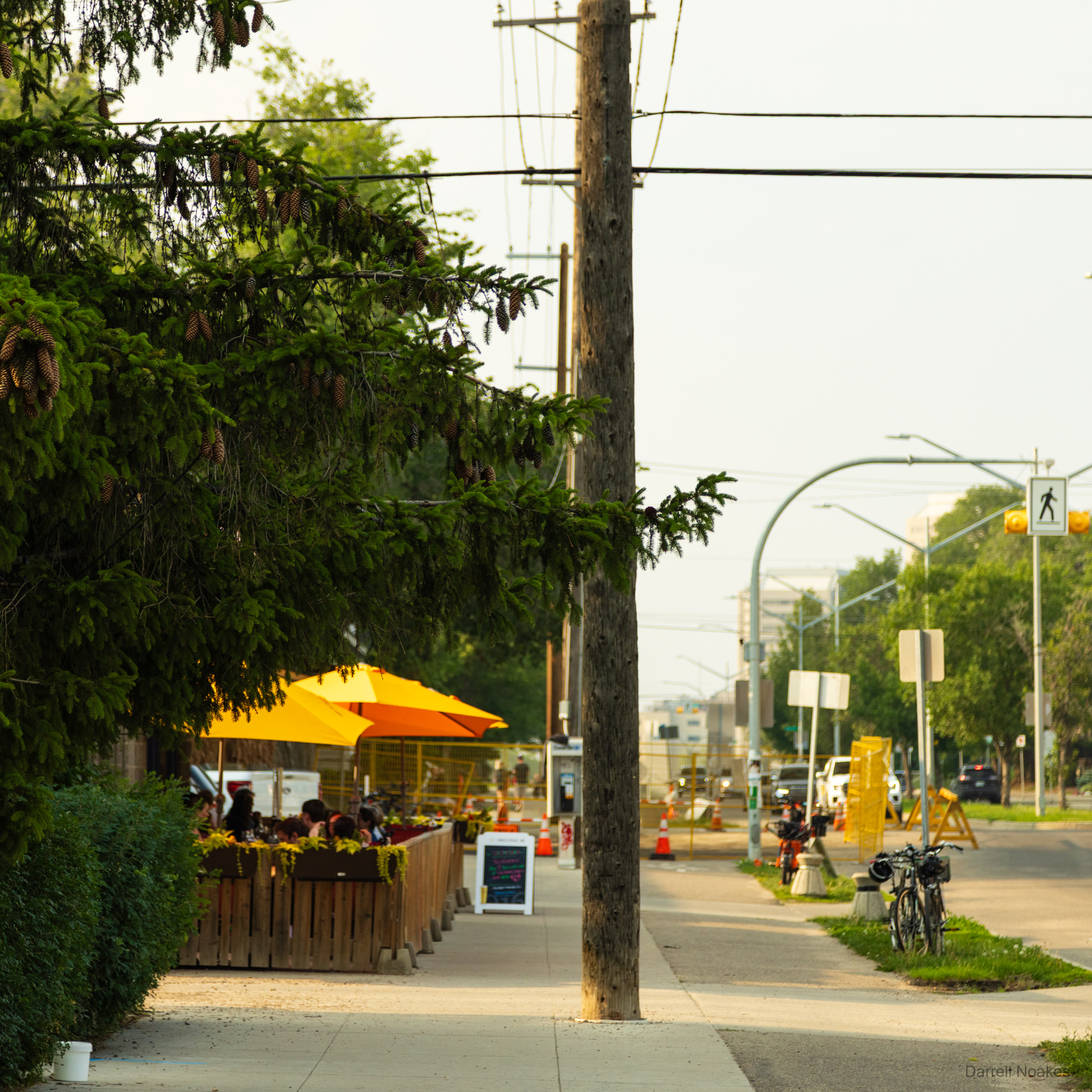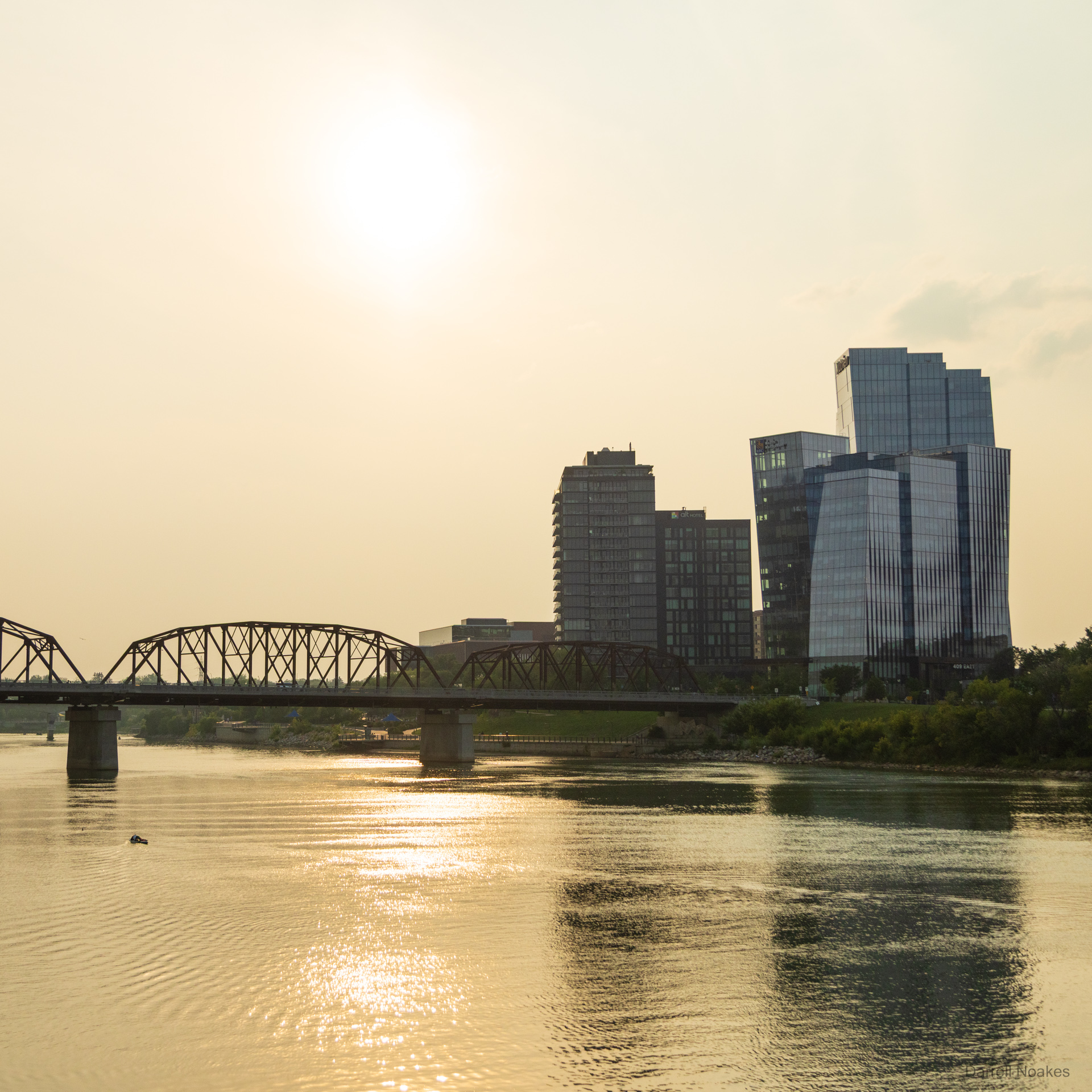 Smoke from northern wildfires descends on Saskatoon, casting the city in muted, sepia tones.